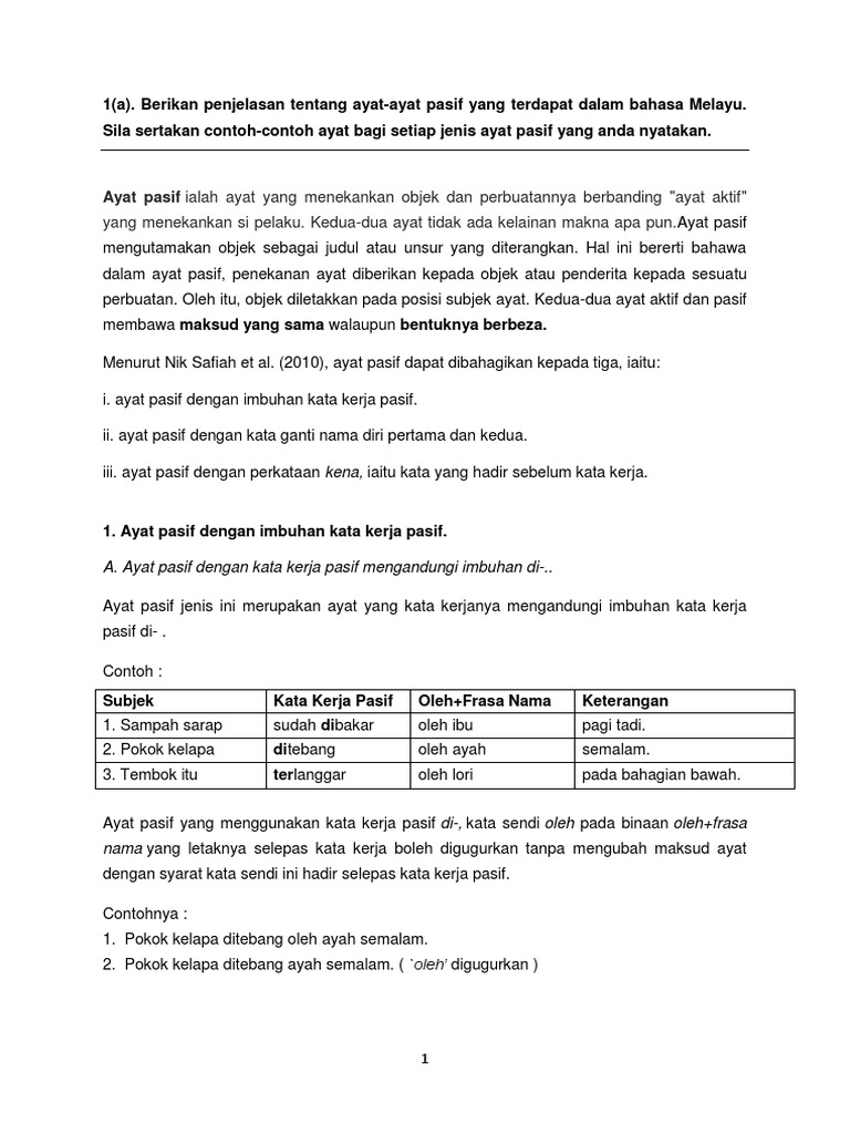 . Contoh kata kerja dibersihkan dalam ayat 34asaya jawab dalam ayat 35a diabaikan dalam ayat 36a kami baiki dalam ayat 37a dan dimasukkan dalam ayat 38a ialah bentuk kata kerja pasifBentuk ini diperoleh dengan menukarkan ayat berbentuk aktif menjadi ayat berbentuk pasif. Pelajar - Semua pelajar diminta beratur. Pendakian paling cepat 9 hari di dalam hutan bagi mereka yang sihat.